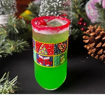 This drink can turn any Grinch Merry! A smooth punch-like cocktail that brings Midori (melon liquor), Apple Schnapps, Blue Caracoa and Barcardi Rum together with Limeade, pineapple juice and a splash of Sprite. Served in 12-ounce glass with ice, rimmed with honey & red sugar and garnished with a lime and cherry. DISCLAIMER: We are not responsible for what happens after TWO Grinches are consumed!
